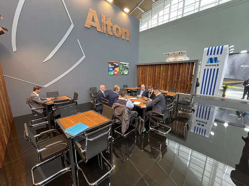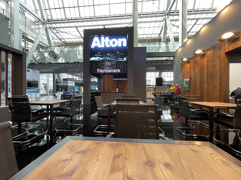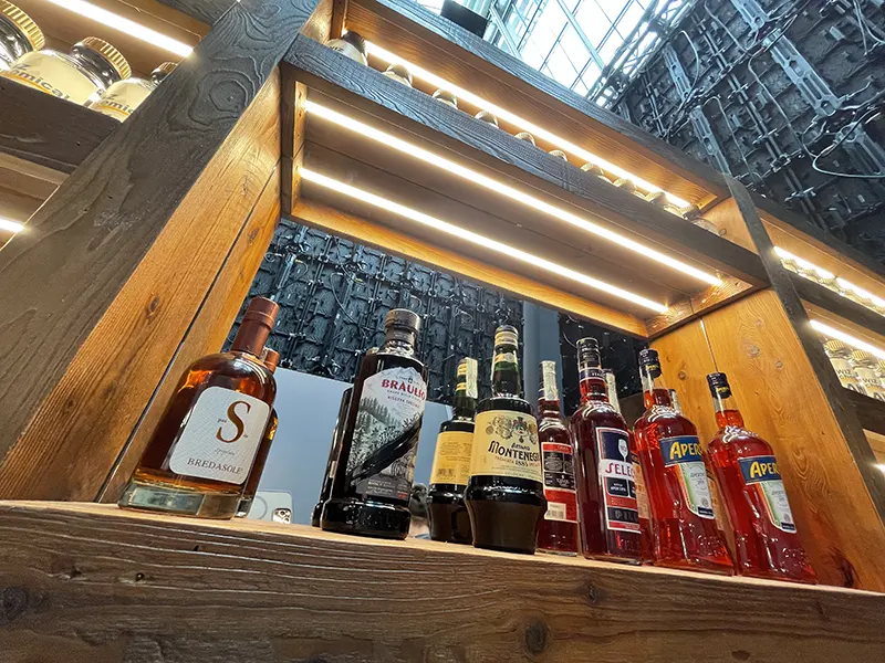 A completare l’esperienza, abbiamo integrato un bar completamente funzionante, progettato per accogliere i visitatori in un ambiente confortevole e raffinato. Le finiture in autentico legno di larice hanno conferito calore e naturalezza allo stand, unendo estetica e matericità per un risultato di forte impatto visivo ed emozionale.